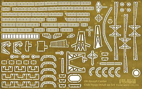 エッチングパーツには手摺、無線檣(しょう)、通信檣、煙突周り付加物(分離板、ジャッキステー、トラス構造の煙突の支え)、ループアンテナ、クレーン、菊花紋章、着艦指導灯(艦尾信号灯、照星灯)などを収録。