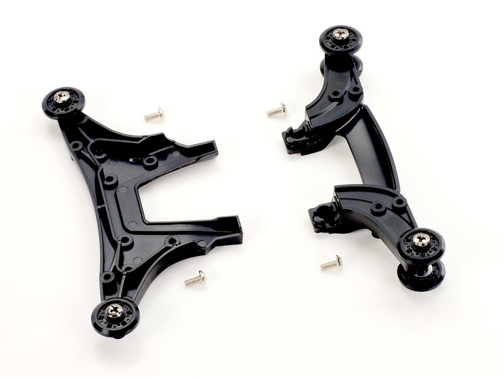 【 駆動効率と軽さに磨きをかけたMEシャーシ 】 MS、MAに続く第三のダブルシャフトモーター搭載シャーシとして誕生したのがMEシャーシです。“ME”とは、「Midship(ミドシップ) Evolution(進化)」の略。「軽く、しなやかに、使いやすく」をコンセプトに開発されたこのシャーシは、シャーシ本体に適度なしなりを持たせ、高い路面追従性を備えつつも、駆動系のねじれ剛性を十分に確保。さらに、MAシャーシの組み立てやすさはそのままに軽量化も実現。シャーシ本体やローラーなどのAパーツは軽量・高剛性のABS樹脂製とし、シャフトの軸受けには摩擦抵抗の少ないPOM樹脂を採用しているのもポイントです。また、前後のバンパーはビスでシャーシ本体に取り付ける分割タイプ。ギヤ比はハイスピードな走りを発揮する3.5:1を標準装備しました。