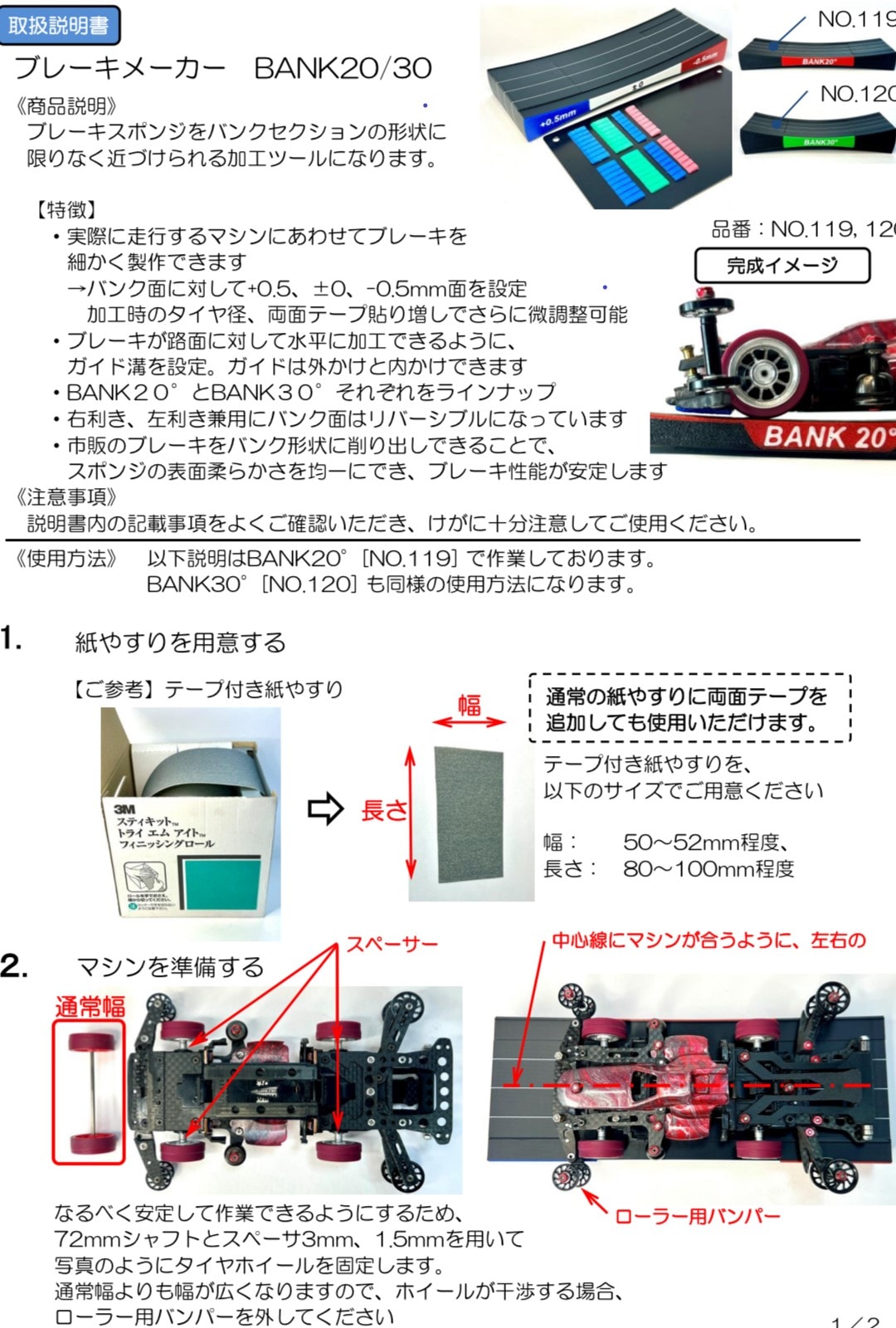 ご覧いただきありがとうございます。 【ご案内】 こちらは、各種単品販売ページになります。 バンク20°とバンク30°の2 種類セットでの購入はお安くお買い求めいただけますので、 当ショップの商品一覧よりご確認ください。 ●各種単品 ◀️このページ ●2種類セット 【セット品】 3レーンセクション用 ブレーキメーカー 《NO.119,120》 【商品紹介】 《3レーンセクション用 ブレーキメーカー》 ブレーキスポンジをバンク形状に限りなく近づけられるようにできるツールです。 ・前後のブレーキスポンジ製作において、やすり でスポンジを削っていく加工になります ・20°バンクセクション形状をベースにタイヤ ホイールをガイドにして加工できるようにして いるため、マシン個々にあわせてブレーキを きれいに正確に仕上げることができます ・加工面は、20°バンク面にたいして、 +0.5mm、±0mm、-0.5mmの段差3パターン を設定しており、使用するやすり厚さや、 マシンタイヤホイール径、接着テープの 貼り増しの工夫で細かくブレーキ高さを 調整できるようになっています ・チューンマシン、オープンマシンやストックク ラスなどの幅広いマシンのブレーキ製作が 簡単になります ・右利き、左利き兼用仕様 <内容物> ・ブレーキ加工ツール本体 《NO.119またはNo.120》 1個 計 1点 <仕様> ・本体 材質 : ABS樹脂 <表示価格> ・一般販売価格1,350円(税抜)に 10%消費税を加算しております。 【注意事項】 <発送について> ・3Dプリント製法による、面のざらつきや 小キズがつきますが品質検査を実施の上、 使用と機能に問題ない状態で出荷させて いただいております。 製品到着時の初期不良や使用時のトラブルによる 早期破損などございましたら、取引メッセージ内 にて無償対応させていただきます。 <その他> ・品質向上のため予告なく仕様変更をする場合が ございますので、ご了承ください。 ・スムーズで気持ちの良い取引を心がけて、 対応させていただきます。 よろしくお願いします。 セイCHAN@クラフト&カスタマイジング #ミニ四駆 #Craft&Customizing #加工ツール #3レーン #ブレーキ加工ツール #ブレーキ #バンクセクション #20°バンク #30°バンク
