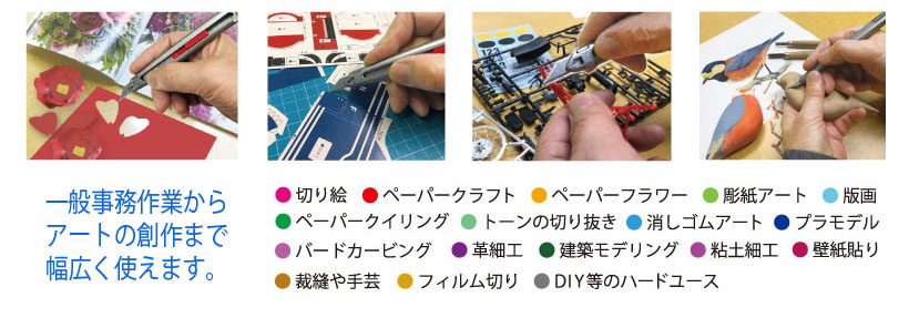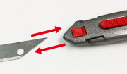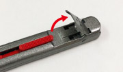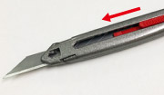 ロック板を立て、スライダーで先端に刃を移動すると簡単に刃が着脱できます。