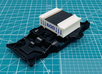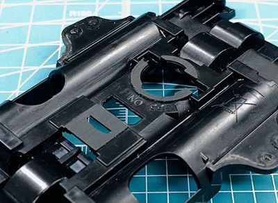 シャーシ底面の溝に沿って、スイッチ周り / モーター下を削ることで、シャーシ底面をフラットに仕上げます。