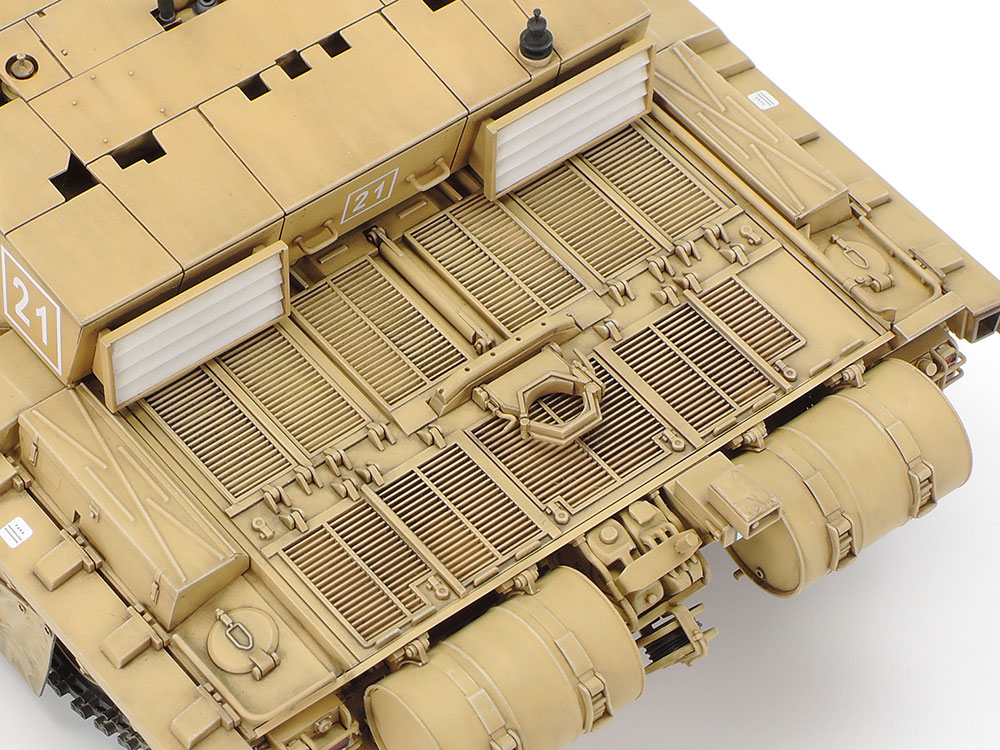 【 実戦装備を満載して迫力を高めたイギリスの主力戦車 】 湾岸戦争で実力を証明したイギリス主力戦車チャレンジャー1、 その完成度を一段と高めた進化タイプがチャレンジャー2です。新設計となった砲塔には第2世代のチョーバムアーマーや強力な55口径120mmライフル砲L30を搭載、射撃統制装置や電子 装置も大幅に強化されました。1998年から部隊配備が開始され、2003年春のイラク戦争では 「砂漠のネズミ」の異名を持つ第7装甲旅団の主力として出動したのです。