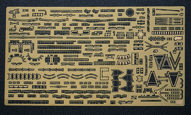 エッチング製の艦橋・煙突・主砲塔の手摺、ファンネルキャップ、搭載水上機揚収用クレーンなど(サイズ:157mmx282mm)