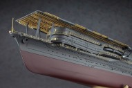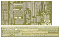 エッチングパーツは2枚構成(サイズ:246.5x43.5mm/216x103.5mm)で、 手すり・人員救助網・飛行甲板下面桁・飛行甲板支柱・艦載機用プロペラ&主脚部品などを再現。 さらに、飛行甲板下面の桁をエッチングに置き換える都合により、 下面の彫刻が入っていない状態の飛行甲板部品を新規プラ部品でセットします。