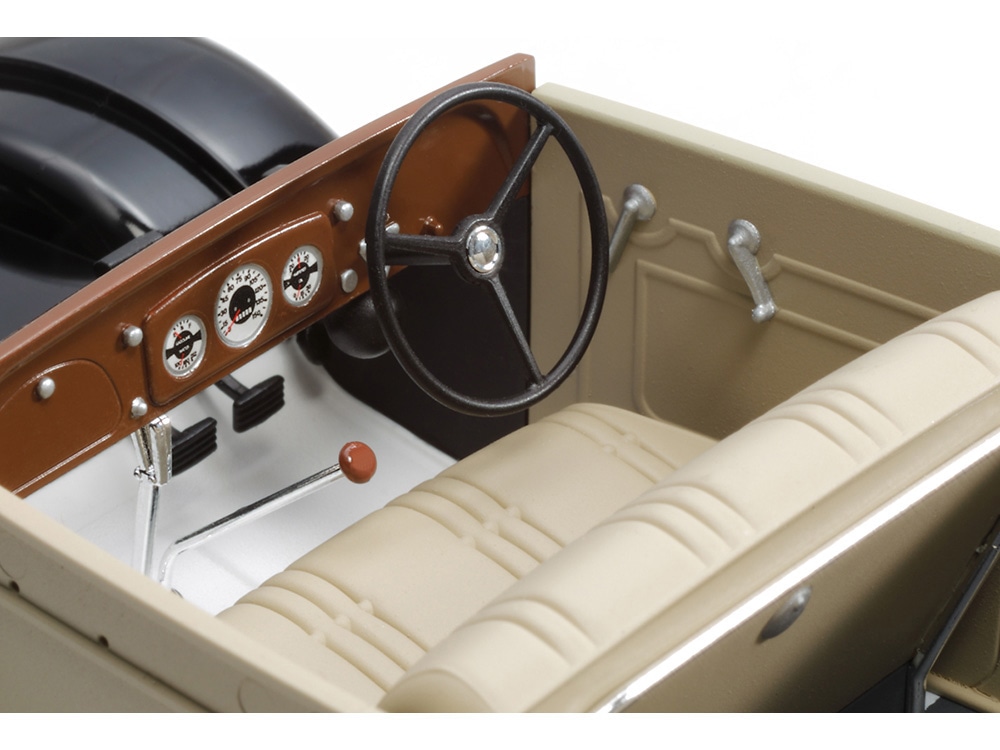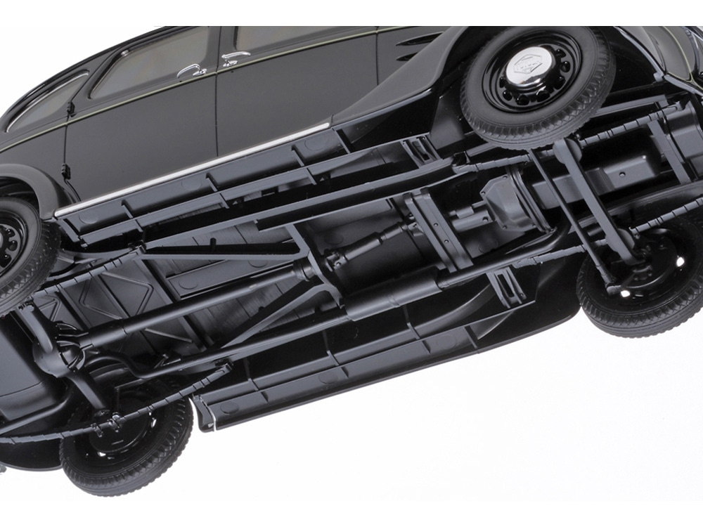 1936年に発表されたトヨタ自動車初の生産型乗用車がトヨダAA型です。それまでの角ばった乗用車のイメージを一新した、滑らかな曲線構成の4ドアセダンボディは流線型と呼ばれ、3.4リッターの直列6気筒エンジンをフロントに搭載して後輪を駆動。シンクロメッシュ機構付き3速トランスミッションや油圧ブレーキなどの先進性に加えて、エンジンを前輪軸上に搭載して前後の重量配分をほぼ50:50としたシャーシ構成も日本車としては初のもので、操縦安定性と優れた乗り心地を実現。1942年までに1404台が生産されました。当時の技術を結集したトヨタの意欲作として、日本の自動車史にその名を留めるトヨダAA型が1/24スケールで蘇ります。