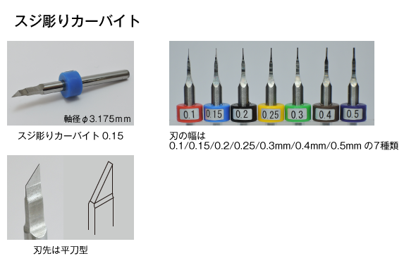 曲線のスジ彫りや0.1~0.2mmの細いスジ彫りカーバイトの使用時には特にご注意ください。