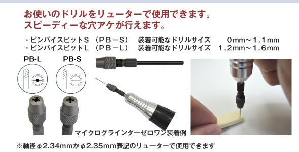 市販のドリルをリューターで使用する事ができます。手作業に比べ、穴アケ加工がスピーディーに行えます。 先端部がドリルチャックになっており、径の異なったドリルを装着する事が可能です。サイズは2種類。