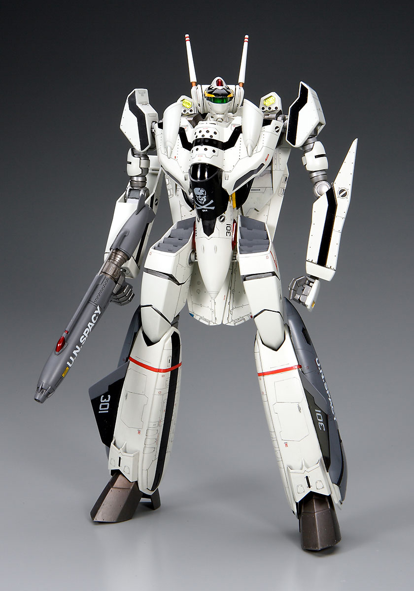 VF-0は、VF-1よりもかなり大きな機体なので、 大きめのポリパーツにより関節の強度を保っています。 主翼は左右に展開可能。手首は可動指を採用しています。 劇中で標準装備として使用されていた、 脚部ファストパックは選択式。 武装はガンポッドが付属します。
