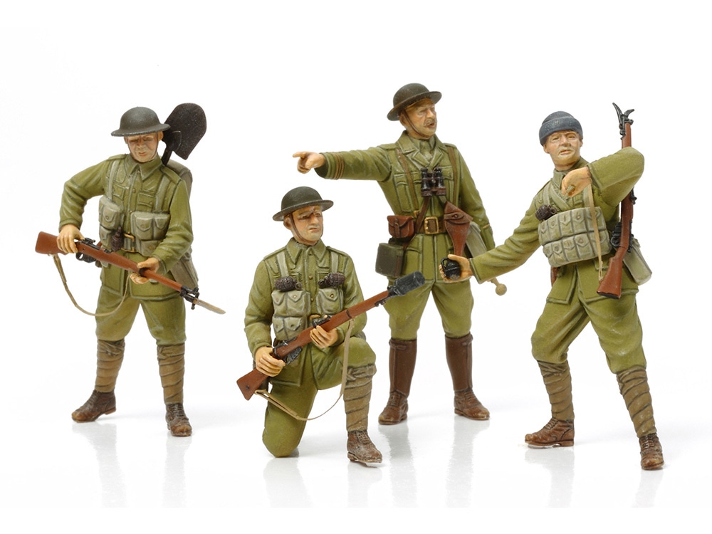 ●第一次大戦後半の軍装で再現されたイギリス歩兵の人形4体に豊富な小火器・装備品をセットしました。