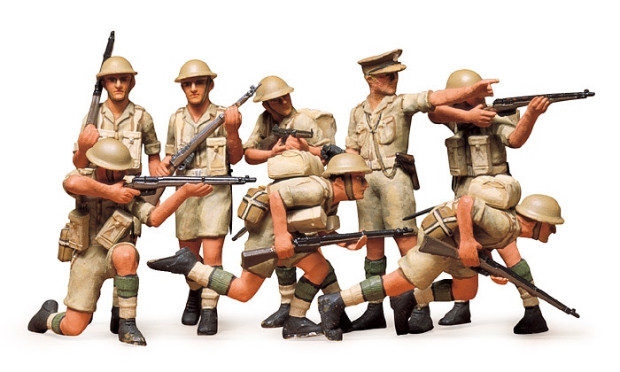 第二次大戦において、北アフリカの砂漠を舞台に、ドイツのロンメル将軍が率いるアフリカ軍団と激しい戦いをくり返し、連合軍のアフリカにおける勝利に大きな貢献を果たしたイギリス軍部隊、第8軍の兵士を再現したプラスチックモデル組み立てキットです。人形はすべて半ズボンをはいた熱帯地域用ユニフォーム姿。エンフィールド・ライフルをかかえて行軍中の兵士、ライフルをかかえて突撃する兵士がそれぞれ2体ずつ、左手で前方を指さす将校、立て膝で射撃姿勢の兵士、立ってライフルを構える立射姿勢の兵士、そしてM1短機関銃を構えて立ったまま射撃する兵士の8体をセットしました。