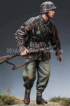 1943年から支給の始まった M42迷彩スモックをまとった 武装親衛隊の歩兵です。 このスモックは 下部に大きなポケットが 2つ付いているのが特徴です。 作例では プレーンツリーパターンですが、 オークリーフパターンの例も 見られます。 ズボンは座面が補強された M42カイルホーゼ型で これも1943年から支給され始めたもの、 足下には1943年から一般的になった、 ゲートル(ガマシェン)と併用する 編上靴を着用。 戦争中期から終戦まで 幅広く使用できるフィギュアです。 単体でも、他のフィギュアや 車両と組み合わせても 使い勝手が良いでしょう。 ヘルメットカバーの有無が選べる スペアヘッド付き。