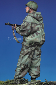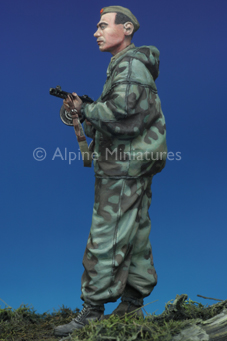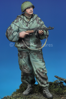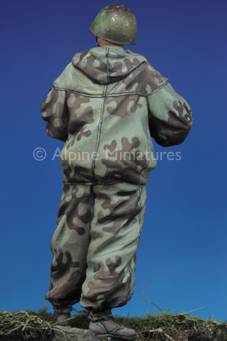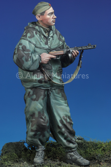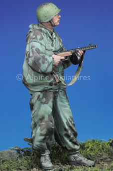 こちらも同じくスカウト兵ですが、 ベルトを装着していない、よりラフ? な感じの服装です。 最近ではインジェクション フィギュアも進化していますが、 ほぼパーティングがなく、服のシワ 等を完全に再現、銃を握る手の 自然さは今後もレジン製に勝ることは できないことを確信させる秀逸な 出来です。こちらはPPsH41を構えて います。 同じくヘルメットと略帽の 2ヘッド付。