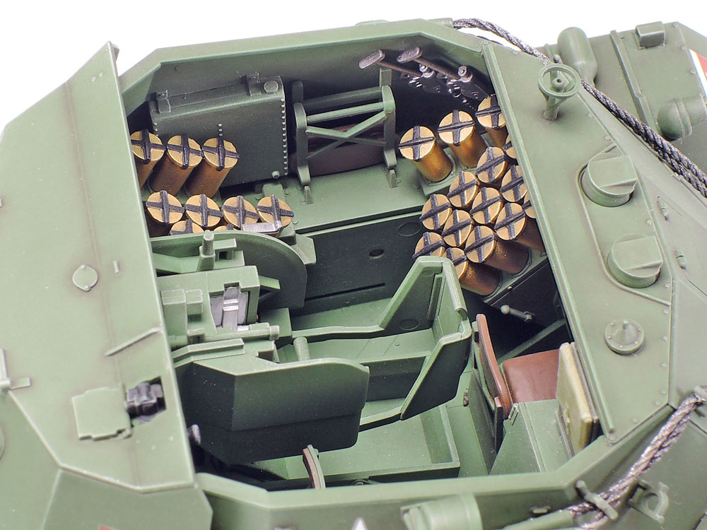★オープントップの戦闘室内部も砲弾ラックや車載機銃など多彩な装備品で立体感十分。