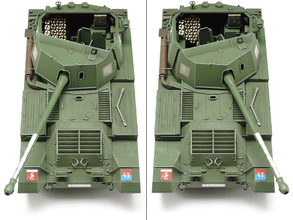 ★入念な実車取材に基づいて、姿勢の低い車体に長砲身の主砲を搭載した精悍な姿を実感豊かにモデル化。