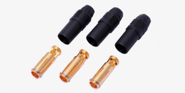 5mmタイプのコネクターを耐熱性のある樹脂に差し込むタイプの大電流用コネクター 10AWGまでのシリコンコードに取り付け可能です。 オスタイプはアンプ側に取り付けます。 重さ:約8g