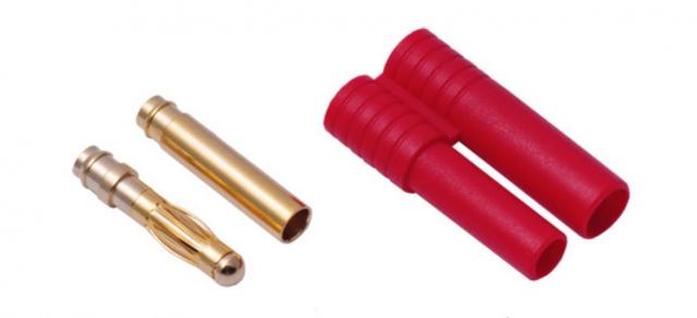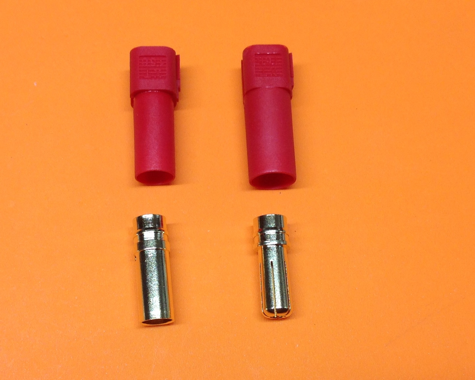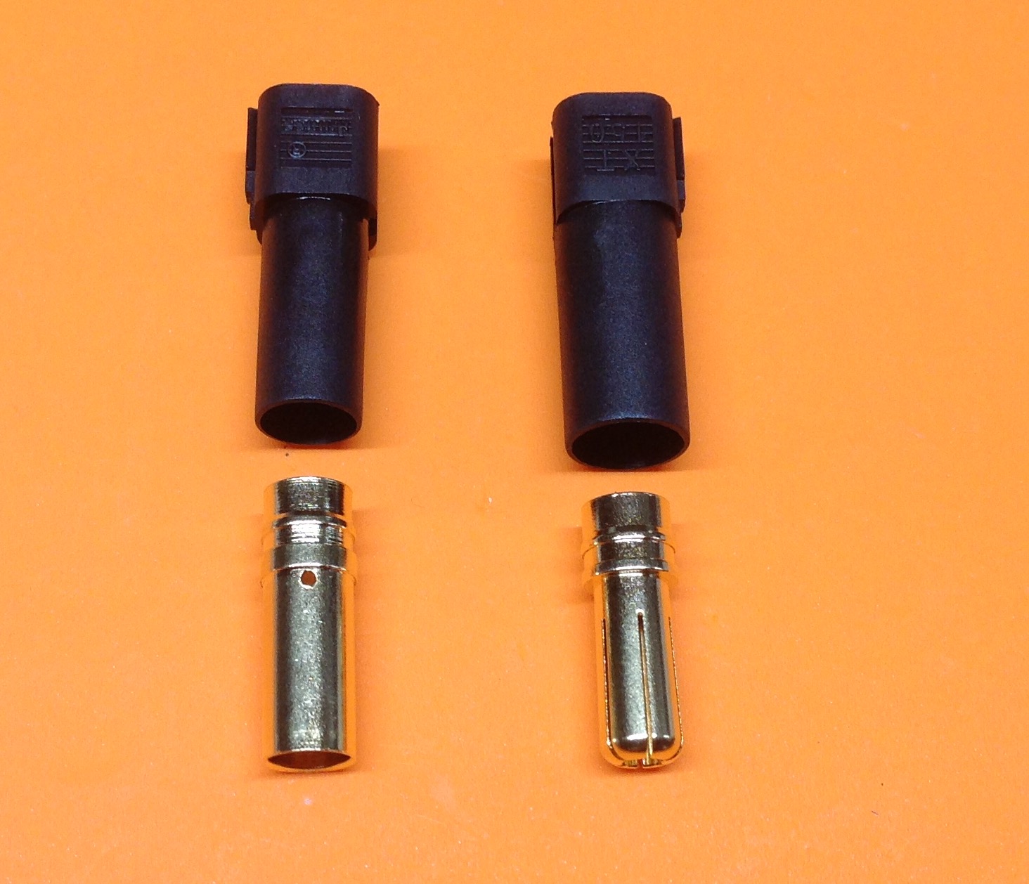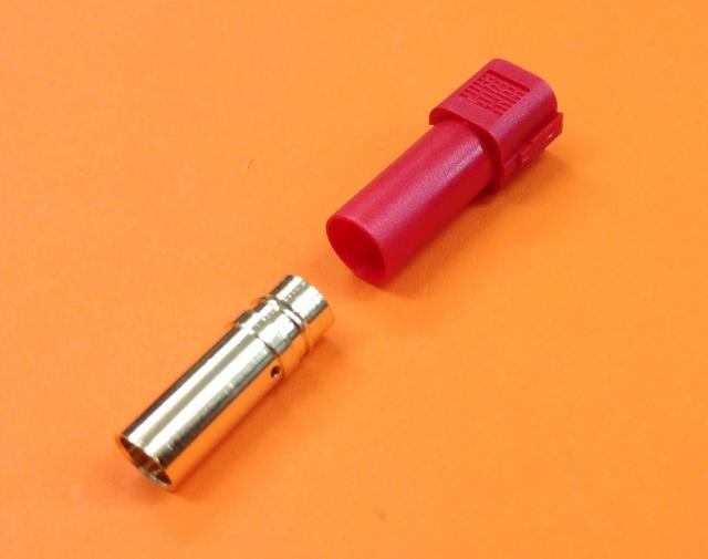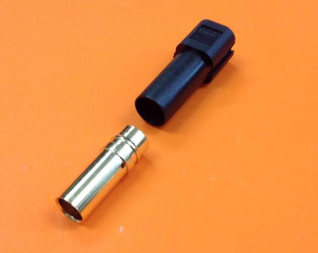 5mmタイプのコネクターを耐熱性のある樹脂に差し込むタイプの大電流用コネクター 10AWGまでのシリコンコードに取り付け可能です。 メスタイプはバッテリー側に取り付けます。 重さ:約6g
