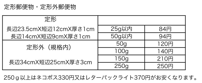 100g以内 180円 長辺34cm以内、短辺25cm以内、厚さ3cm以内